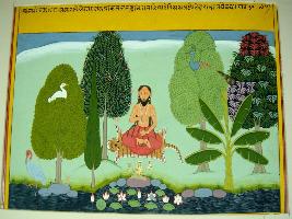 | Description / विवरण | Miniature painting based on Sarangatattva - an independent work of Sankhya school of philosophy depicting a yogi in meditation and sitting on the skin of tiger near a river bank. Trees, birds and flowers are seen around him. |