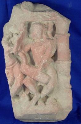 | Description / विवरण | Sculptured architectural fragment depicting a male musician playing Dholak in niche. His face and left hand are slightly mutilated. To his right another figure is depicted whose head and part of legs are broken. Part of pillar at extreme left is chopped off. |