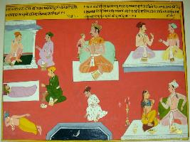 | Description / विवरण | Miniature painting based on Sarangatattva work of Sankhya school of philosophy. In left side two persons are sitting, one is thinking, below hakim is busy in making medicine for the patient, below one person is sleeping. In middle a person is sitting and holding a boy figure in his hand, one person is hunting fish from the pond. In right two nobels are sitting above and a husband and wife sitting together below. It is an incomplete painting. |