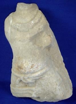 | Description / विवरण | Torso of a male figure wearing a beaded necklace and waist band, knot of which is prominent. The left part of thigh is chopped off. |