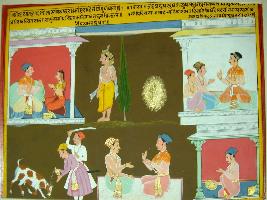| Description / विवरण | Miniature painting based on Sarangatattva - an independent work of Sankhya school of philosophy depicting that death is inevitable. Yamraj is standing at the centre. It tells that everyone has to leave their loved ones one day, husband and wife, children and father and so on. Even a butcher is not aware that he can die today along with his goat. |