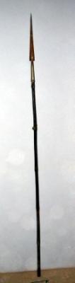 | Description / विवरण | Bamboo spear having triangular iron head which is rusted. The budi is missing. |