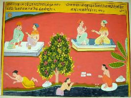 | Description / विवरण | Miniature painting based on Sarangatattva - an independent work of Sankhya school of philosophy. In the upper left and right parts, two men are depicted talking to each other. In the lower part, a man is performing puja in river. |