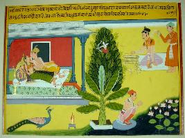 | Description / विवरण | Miniature painting based on Sarangatattva - an independent work of Sankhya school of philosophy depicting a king sleeping with his queen, eating food and worshipping at the bank of river. Kamdev is sitting on tree and aiming with his arrow at the sleeping pair. |