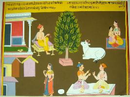 | Description / विवरण | Miniature painting based on Sarangatattva - an independent work of Sankhya school of philosophy depicting a man sitting on a couch outside a house, a woman with her child in the top right and left parts of the painting respectively. In the lower part, a woman and two seated nobles are depicted. |