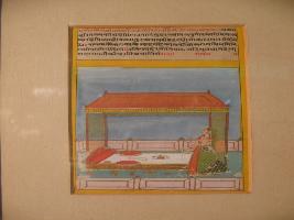 | Description / विवरण | It is a rag Dipak painting with desi ragini. Here the queen is shown extremely beautiful and she is waiting anneously for king to come. She appears to be as beautiful as celetial body wearing red, green long skirt ghagra with golden work. She is stand |