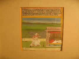 | Description / विवरण | It is a rag-Bhairav painting with Bairari ragini. In this painting a woman is going towards her room. Inside the room a bed is visible along with bolster masand and some utensils. She is wearing white long skirt ghagra and white veil with golden wor |