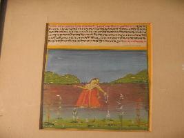 | Description / विवरण | It is a rag Dipak painting with ragini Kamod. Here the queen is walking in her thoughts. She is holding rosary in oen hand and flwoer in another. She is wearing red golden long skirt ghagra and red veil. She is bejewelled. In the foreground and backgr |