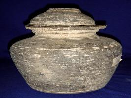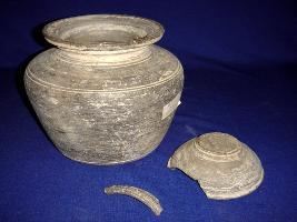 | Description / विवरण | Terracotta pot, circular in shape, with a lid, which is broken from one part. It has rim and flat circular base. |