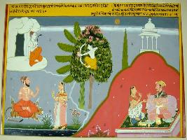 | Description / विवरण | Miniature painting based on Sarangatattva - an independent work of Sankhya school of philosophy depicting Shiv in the right up cornerbelow them a sage and an apsara are seen with Kamdev sitting on the tree with bow and arrow. In the other side king and queen are sitting on palatial balcony. |