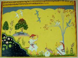 | Description / विवरण | Miniature painting based on Sarangatattva - an independent work of Sankhya school of philosophy depicting a man wearing hat and going for hunting with bow and arrow and then resting under a tree. |