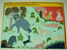| Description / विवरण | Miniature painting based on Sarangatattva - an independent work of Sankhya school of philosophy depicting a man in left up corner standing in front of a tiger and talking to it. Other wild animal-elephant, boar, stag, deers, fox, cheetah and hares are seen in the painting. It is an incomplete painting. |
