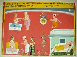 | Description / विवरण | Miniature painting based on Sarangatattva - an independent work of Sankhya school of philosophy depicting a noble giving money to a poor man in the right up corner. Vishnu is seen in the centre and worshipped by a man. In the lower side a king is seen talking with a couple and in the lower left corner a noble is seen resting on bed. |