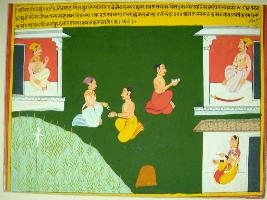 | Description / विवरण | Miniature painting based on Sarangatattva - an independent work of Sankhya school of philosophy depicting on the upper right corner a man sitting in a palace facing left. Next to him a man is seen giving daan. At the left side a man is seen sitting in a palace in front of whom a man is sitting holding a manuscript. Below him a female is seen sitting in front of a house. At the lower right corner part of field is depicted. The painting is unfinished. |