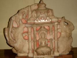| Description / विवरण | Fragment of a Jain temple depicting Jain Tirathankara-Parshwanath in Dhayana mudra. He is sitting under 5-hooded snake. Two more seated Jain images in Dhayana mudra on the upper side. Makara Toran is seen but the left sided makara is mutilated. |