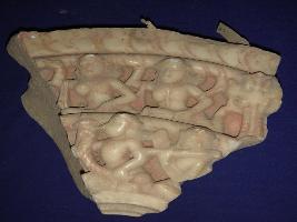 | Description / विवरण | Fragment of a panel with the depiction of two male musicians on the lower part and two female musicians on the upper part, towards the left of female musician a mythical animal is carved. |