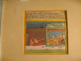 | Description / विवरण | This is Rag Malkosh printing with Malkosh ragini. In this painting queen is sitting on the chair and two female musicians are playing music in front of queen. Queen is wearing red skirt with yellow blouse and long golden necklace. In the background scene of hawalies. Gold |