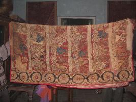 | Description / विवरण | It is a jajam. It is completely printed and it has attached lining and red cotton piping. It also has floral prints with images of doola maru. |
