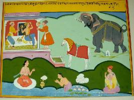| Description / विवरण | Miniature painting based on Sarangatattva - an independent work of Sankhya school of philosophy depicting a king wearing turban and being helped by two attendants. A horse and an elephant are seen, while in the lower portion he is sitting and cleaning his teeth, taking bath and praying. |