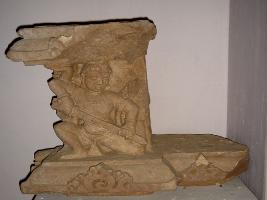 | Description / विवरण | An architectural fragment, depicting two warriors on two sides. On the front face, the warrior has a sword in right hand pointing diagonally and the lower part in left hand. On the other side warrior s face is half mutilated from right side. The sword is held in right hand diagonally pointing upwards and the middle part held in left hand. The base of the fragment has designs on it. |
