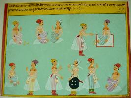 | Description / विवरण | Miniature painting based on Sarangatattva - an independent work of Sankhya school of philosophy. On the upper part five people are depicted- one standing and four seated. In the lower part six people are depicted, two seated and four standing, one of them is holding a shield and sword. |