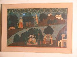 | Description / विवरण | This painting is in two parts. In one part Radha and Krishna are walking .The Krishna is holding rosary in hands. Radha is watching Krishna. One servant is walking behind .In second part Radha and Krishna are sitting on a Sofa and two servants are talking. |