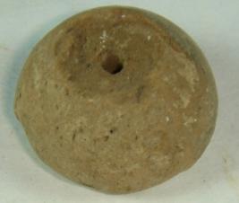 | Description / विवरण | Perforated terracotta bead, betel nut in shape with a slight depression in the centre. The body part is partly mutilated. |