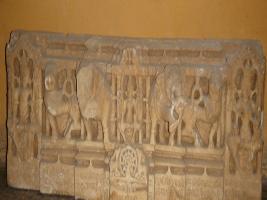 | Description / विवरण | Fragment of a pedestal of a Jain Tirathankara. At the centre of the pedestal the image of goddess Indrani is seen seated in lalitasana and one of her hand is in Abhaya mudra. Below her is a depiction of chakra in centre, and two seated animal figures are seen at both sides. At her both side two elephants are seen, of which the half of the body from head of the elephant in right side is broken. At both side of these elephants two mythical animal figures are seen. At the right end Indra is seen seated in lalitasana and his right hand is in Abhaya mudra and left hand holding a vajra or lotus At the extreme left a depiction of mother and childe is seen where mother is sitting in lalitasana and child is sitting on her lap of left side. Below the pedestal, one line inscription is seen at the centre and two lines inscription are seen in other parts written in Sanskrit language. |