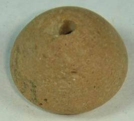 | Description / विवरण | Perforated terracotta bead, betel nut in shape, with a slight depression on the centre of base. |