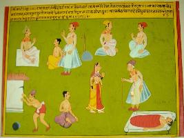 | Description / विवरण | Miniature painting based on Sarangatattva - an independent work on Sankhya school of philosophy. In the upper side, a king is depicted sitting and talking to a nobleman and a Brahman, two men are sitting and talking. In the lower side, a man is using a plough, a man sitting, a woman and an old man are standing and a man lying on the bed. |