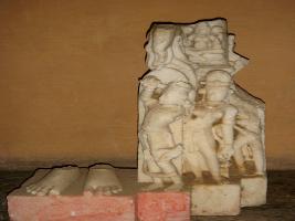 | Description / विवरण | Fragment of a sculpture showing a pedestal on which the image of Rishavdeva stood on, but only the feet of Rishavdeva is seen and rest part are missing. At the right side of the sculpture attendants are seen. The first figure at the left side in a male chauri bearer, holding a chauri in his left hand while his right hand in broken. Next to him a female attendant is seen in standing posture. Her right hand is lying parallel to her body while her left hand is holding a lotus. Next to her another chauri bearer is seen, the top of which is chopped off. At the top of a female figure seated in lalitasana is seen. The attributes of her from right below 1. In Abhaya mudra 2.Holding a lotus 3.Holding a chakra 4.Holding a shankha, She is adorned with jewels and probably vaishnavi. Below the pedestal, inscription of three lines are written in Sanskrit language. At the centre of which a bull is craved. |