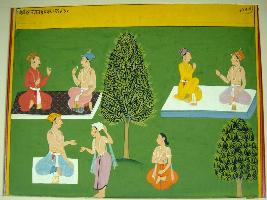 | Description / विवरण | Miniature painting based on Sarangatattva - an independent work of Sankhya school of philosophy depicting two pair of men at the upper left and the right parts. At the lower left, a man is giving alms to another. To their left, a sadhu is depicted in yogic posture. |