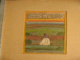| Description / विवरण | This is rag Malkosh painting with Malkosh ragini. In this painting background is natural. Upper side some letters in devangari. In this painting queen is cry and queen is wearing white long skirt in golden work. In the background green tree and some grass |