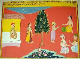 | Description / विवरण | Miniature painting based on Sarangatattva - an independent work of Sankhya school of philosophy depicting a man sitting inside his house and a woman is leaving, at the lower part, woman is shown taking a bath. In the left side, two men are sitting and talking to each other and above them a man is standing with folded hands before a seated man. |