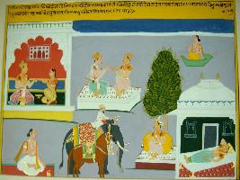 | Description / विवरण | Miniature painting based on Sarangatattva - an independent work of Sankhya school of philosophy. In the painting, starting from the left to right, a couple sitting in their house, two men seated on a couch, a man on Vayuyaan, a Brahman seated on mat, an elephant rider with a horse standing in front of a king and a man sleeping in his house are depicted. |