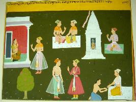 | Description / विवरण | Miniature painting based on Sarangatattva - an independent work of Sankhya school of philosophy. Starting from the left to right, a woman seated in a balcony and talking to a man standing outside, two seated man talking, a man worshipping and idol, two standing men talking and a man giving daan are depicted. It is an incomplete painting. |