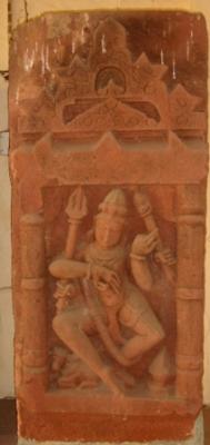 | Description / विवरण | Independent sculpture of Natraj in dancing pose having four arms. Attributes from right below 1 dancing mudra 2 trident 3 Kharbhanga 4 dancing mudra. He is wearing a garland and adorned with jewels. On the right below Nandi and on the left a Kalsi is depicted. |