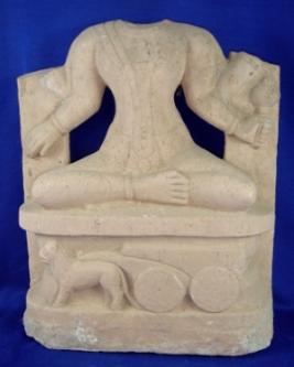 | Description / विवरण | Independent sculpture of a four armed griha among Navagraha in seated position upon pedestal drawn by a chariot by lion. His head and two arms are missing. He is holding a conch with lower left arm. |