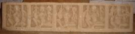 | Description / विवरण | Sculptured architectural fragment of a panel depicting Brahmani, Vaishnavi, Varahi, Andri and Ganesh respectively from right to left in pillared niches in seated position. Attributes of Brahmani from right below- 1 varada mudra 2 lotus 3 manuscript 4 kamandal. Attributes of Vaishnavi from right below- 1 Varada mudra 2 mace 3 chakra 4 conch. Attributes of Varahi from right below- 1 Varada mudra 2 mace 3 chakra 4 conch. Attributes of Andri from right below- 1 Varad mudra 2 Vajra 3 ankush 4 pot. Attributes of Ganesh from right below 1 axe 2 axe 3 lotus 4 bowl of sweets. |