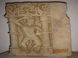 | Description / विवरण | Fragment of a sculpture where a male dancing figure is carved in a pillared niche. His right hand is raised upwards and left hand placed on the waist. |