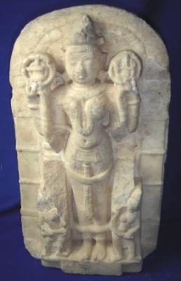 | Description / विवरण | Small independent sculpture of four handed Parvati in standing position. Her attributes from right below- 1 Chopped off 2 Shivlinga 3 Ganesh 4 Chopped off. Below her legs two male attendants are seen. On the pedestal three letters in Devnagri are written. |