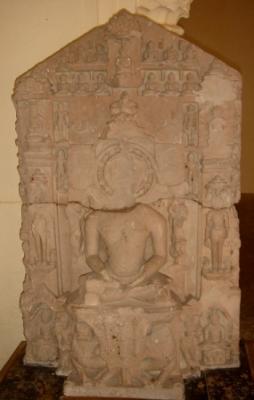 | Description / विवरण | Independent sculpture of Jain Tirathankara Rishabh Nath sitting in Padmasana on high pedestal. His head, both knees and palms are chopped off. A well designed nimbus is seen behind head. Below the pedestal two lion are seen but the head of left one is chopped off. He is flanked by standing Jinas on the sides and seated Tirathankaras in dhyana mudra in the upper part. |