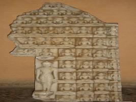 | Description / विवरण | Fragment of an independent sculpture, probably the left portion of a parikar, depicts a standing Jaina Tirathankara in right, flanked by numerous seated Jinas in Dhayana mudra, on left end there is a row of standing Jinas. |