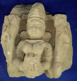 | Description / विवरण | Sculptured architectural fragment depicting goddess Saraswati in niche. Her body below waist is missing. Her attributes from right below i conch ii an arrow or pen iii club iv conch. She is wearing a Karand mukuta and round earrings. |
