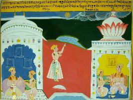| Description / विवरण | Miniature painting based on Sarangatattva - an independent work of Sankhya school of philosophy depicting two kings talking to their ministers in the left and the right parts of the painting. In the centre, a man is standing and pointing his fingers towards the sky. |