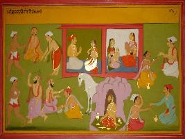 | Description / विवरण | Miniature painting based on Shri Bhagwat Gita. It depicts one man giving daan to Brahman at upper left part. To their right two women are shown sitting with son on their lap. To their right, a man shown talking to his wife. At the upper right part, one man is giving daan to a Brahman and other is pulling his upper cloth. At the lower part, a sage is sitting before a cave. To its right, one sage is giving blessing to a man and to its right, he is hitting another man. |