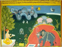 | Description / विवरण | Miniature painting based on Sarangatattva - an independent work of Sankhya school of philosophy depicting a saint beneath a tree, in left side, with a book in his hands. A snake and a caged bird are seen in front of him. In the upper part, Brahma is depicted beyond the clouds and Rahu and Ketu are engulfing the sun and the moon. In the bottom, an elephant is depicted tied with chain. |