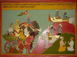 | Description / विवरण | Miniature painting based on Shri Bhagwat Gita. It depicts Krishna preaching Arjun that if you won t fight this war then everyone will criticize you and that is worst then death. Those who praise you will also start criticizing you. |