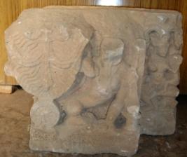 | Description / विवरण | Sculptured architectural fragment depicting Singh Sardar, head of lion is chopped off. On the right below one chakra is depicted. On the left side a female is seen in seated posture. |