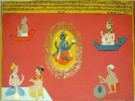 | Description / विवरण | Miniature painting based on Sarangatattva - an independent work of Sankhya school of philosophy depicting Lord Vishnu in the centre, surrounded by rays, in the left side of him, a king is sitting on viman and a demon in the right. In the lower part, two seated men talking and a potter on his wheel are depicted. |
